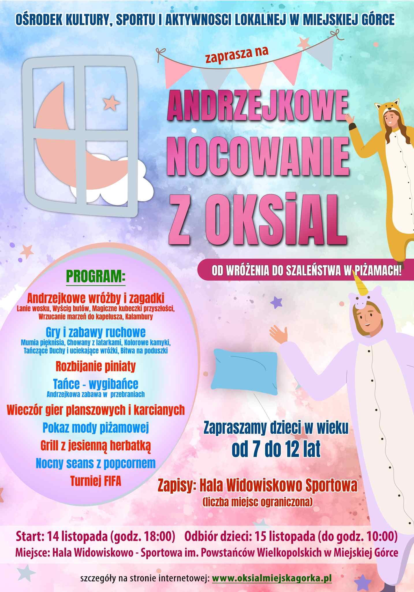 Ośrodek Kultury, Sportu i Aktywności Lokalnej w Miejskiej Górce zaprasza na „Andrzejkowe Nocowanie z OKSiAL” – pełne zabawy, wróżb, tańca i dobrej energii!