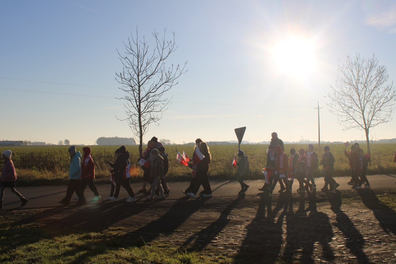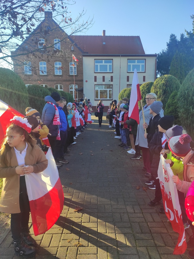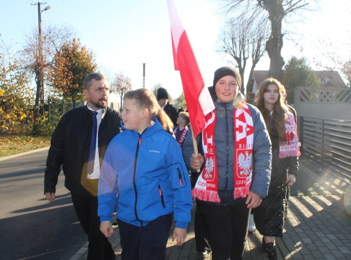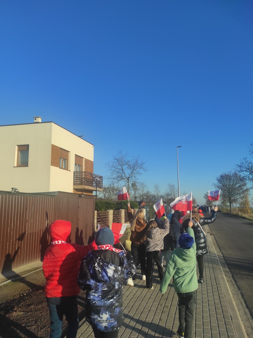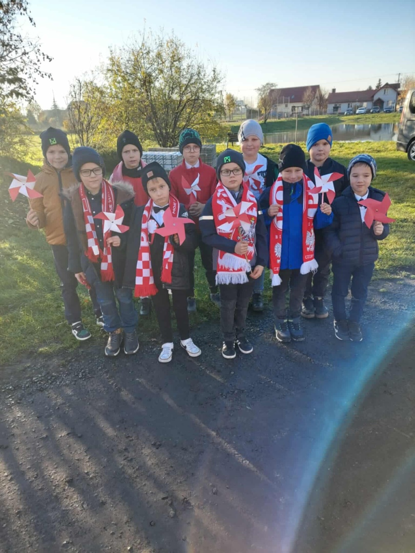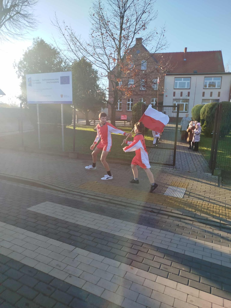 Następnie odbyła się sztafeta z biało-czerwoną flagą, w której reprezentanci uczniów przebiegli ulicami wioski. Pozostali uczniowie kibicowali im z entuzjazmem, tworząc gorącą, patriotyczną atmosferę. Tradycyjnie nie zabrakło również marszu do Dębu Niepodległości w pobliskim lesie – miejsca szczególnego dla całej szkolnej społeczności.