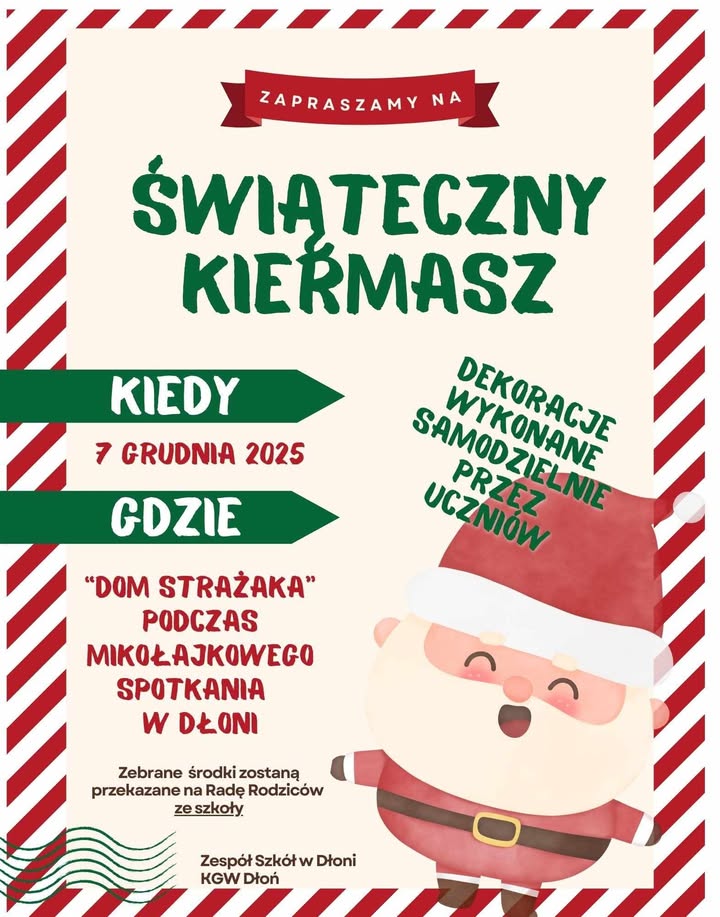 Zespół Szkół w Dłoni wraz z Kołem Gospodyń Wiejskich Dłoń zapraszają mieszkańców na wyjątkowy Świąteczny Kiermasz, który odbędzie się 7 grudnia 2025 r. podczas mikołajkowego spotkania w budynku Domu Strażaka.