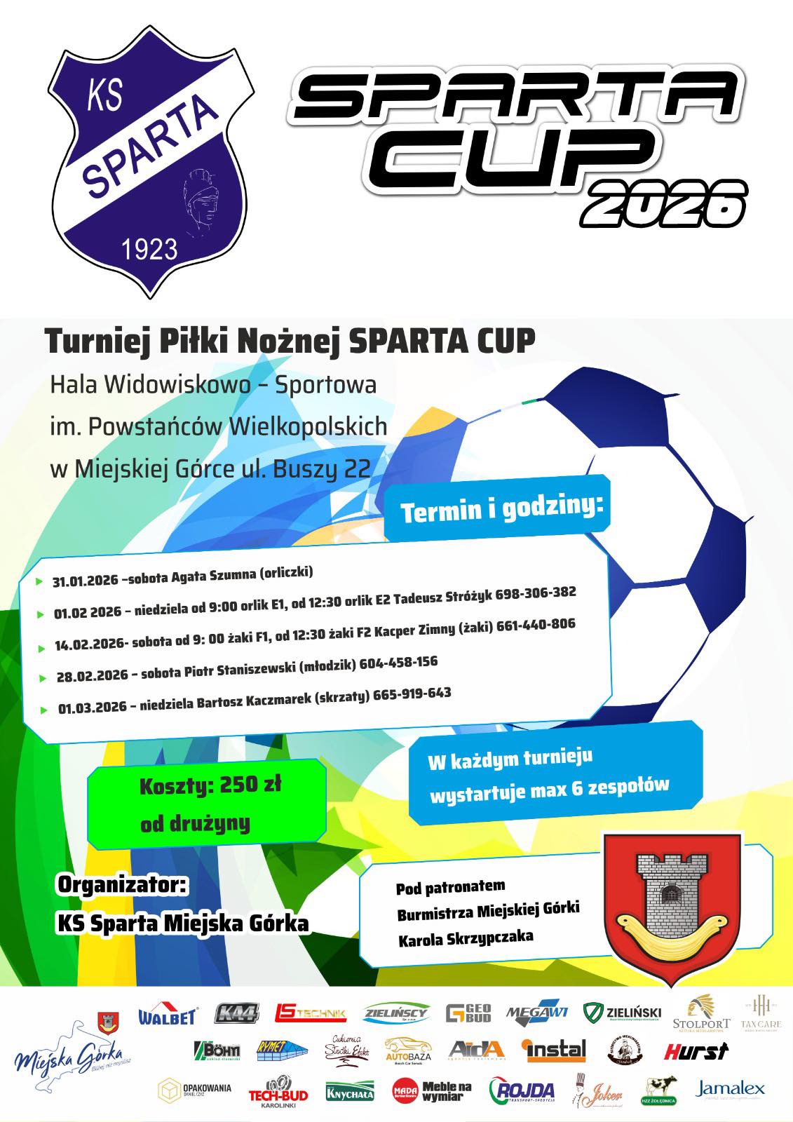KS Sparta Miejska Górka zaprasza do udziału w Sparta Cup 2026 – cyklu halowych turniejów piłki nożnej dla dzieci i młodzieży. Zawody odbędą się na przełomie stycznia, lutego i marca 2026 roku w Hali Widowiskowo-Sportowej im. Powstańców Wielkopolskich w Miejska Górka, przy ul. Buszy 22.